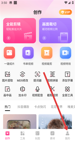 1、啟動(dòng)剪意視頻剪輯的APP,進(jìn)入時(shí)點(diǎn)擊底部工具的按鈕。