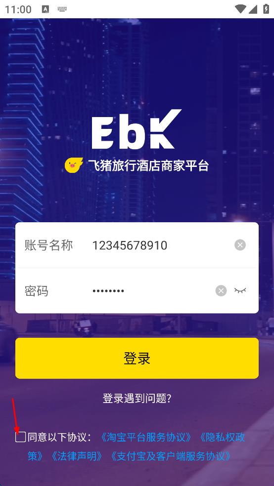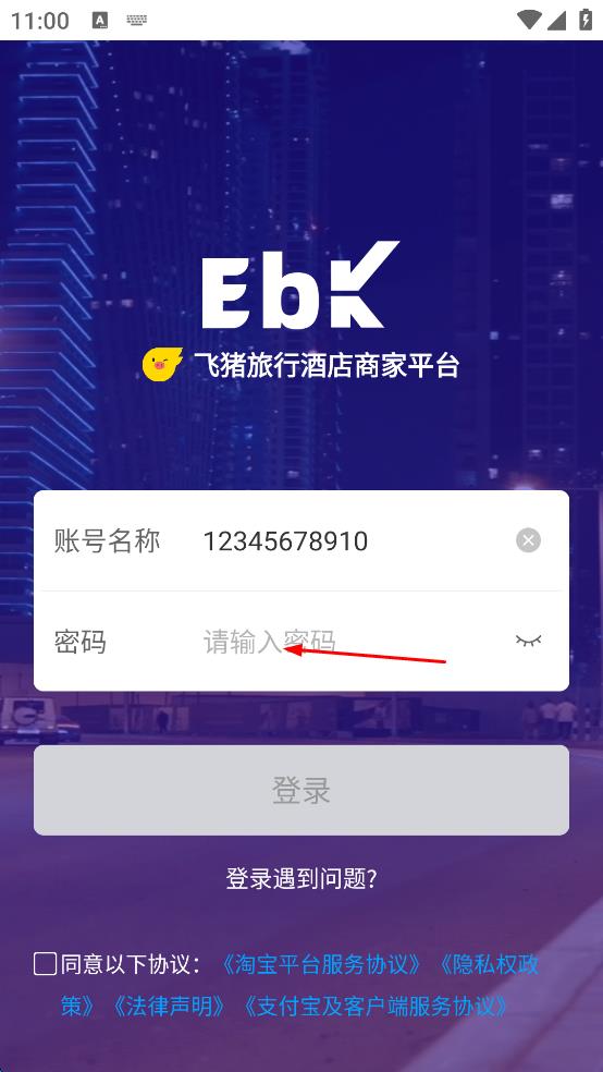 1、打開飛豬旅行酒店商家平臺,在登錄界面的“賬號名稱”輸入框中,填寫好EBK賬號。