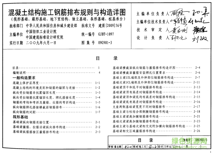 09G901-3《混凝土結(jié)構(gòu)施工鋼筋排布規(guī)則與構(gòu)造詳圖》(筏形基礎(chǔ)、箱形基礎(chǔ)、地下室結(jié)構(gòu)、獨(dú)立基礎(chǔ)、條形基礎(chǔ)、樁基承臺(tái))是對 04G101-3《混凝土結(jié)構(gòu)施工圖平面整體表示方法制圖規(guī)則和構(gòu)造詳圖》(筏形基礎(chǔ))、08G101-5《混凝土結(jié)構(gòu)施工圖平面整體表示方法制圖規(guī)則和構(gòu)造詳圖》(箱形基礎(chǔ)和地下室結(jié)構(gòu))及 06G101-6《混凝土結(jié)構(gòu)施工圖平面整體表示方法制圖規(guī)則和構(gòu)造詳圖》(獨(dú)立基礎(chǔ)、條形基礎(chǔ)、樁基承臺(tái))國家建筑標(biāo)準(zhǔn)設(shè)計(jì)圖集鋼筋排布的細(xì)化和延伸,配合 04G101-3、08G101-5 及 06G101-6 圖集解決施工中的鋼筋翻樣計(jì)算和現(xiàn)場安裝綁扎,從而實(shí)現(xiàn)設(shè)計(jì)構(gòu)造與施工建造的有機(jī)結(jié)合,為施工人員進(jìn)行鋼筋排布和下料提供技術(shù)依據(jù)。