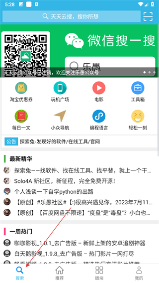 1、打開(kāi)天天云搜APP,點(diǎn)擊底部導(dǎo)航欄搜索選項(xiàng),可在頂部搜索欄輸入關(guān)鍵詞,同時(shí)頁(yè)面快捷入口及推薦內(nèi)容。