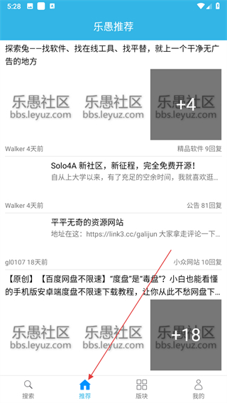 2、點(diǎn)擊底部導(dǎo)航欄推薦選項(xiàng),進(jìn)入樂(lè)愚推薦頁(yè)面,能查看社區(qū)推薦的軟件、資源網(wǎng)站、教程等熱門(mén)優(yōu)質(zhì)分享內(nèi)容。