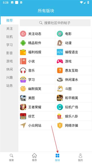 3、點(diǎn)擊底部導(dǎo)航欄版塊選項(xiàng),進(jìn)入所有版塊頁(yè)面,這里有關(guān)注動(dòng)態(tài),精品軟件,電影,編程語(yǔ)言等眾多分類板塊。