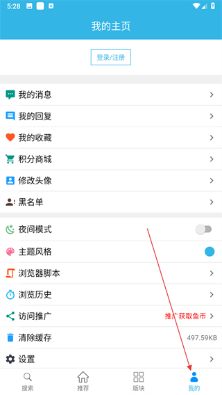 4、點(diǎn)擊底部導(dǎo)航欄我的選項(xiàng),進(jìn)入我的主頁(yè)頁(yè)面,可進(jìn)行登錄/注冊(cè),還能查看我的消息,我的收藏個(gè)人相關(guān)設(shè)置。