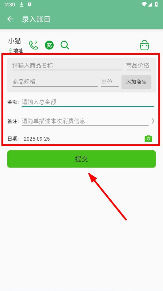4、進入錄入賬目頁面,填寫信息,最后點擊提交按鈕,完成記賬操作。