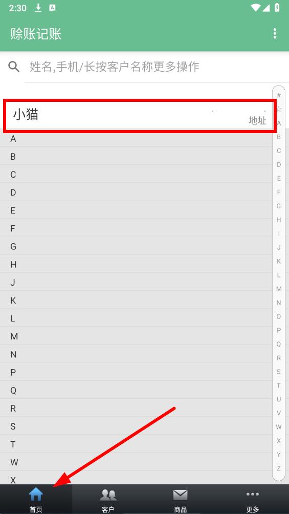 3、添加好客戶后,點擊底部導(dǎo)航欄的首頁選項,回到首頁,點擊添加的客戶。