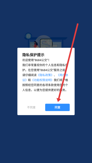 1、打開8684實(shí)時(shí)公交后,點(diǎn)擊彈窗中的同意按鈕,進(jìn)入使用。