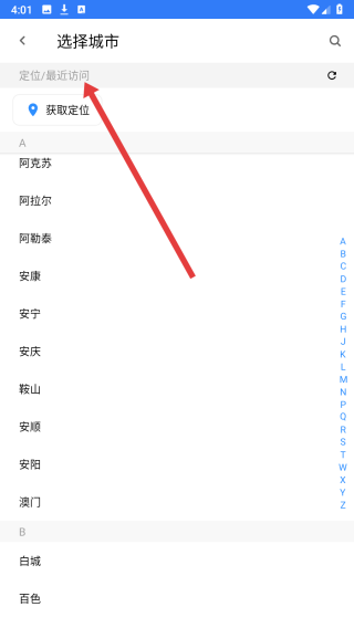 2、在進(jìn)入到選擇城市頁面中,點(diǎn)擊上方搜索欄輸入要定位的城市。