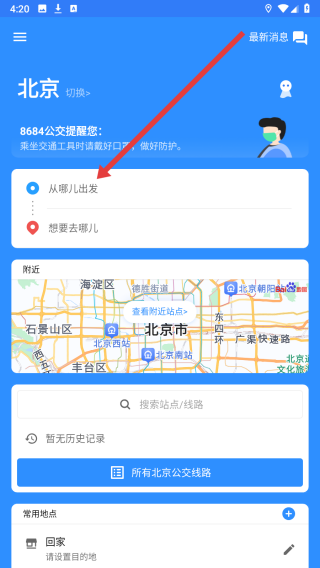 3、在進(jìn)入到應(yīng)用首頁中,可以點(diǎn)擊箭頭指向區(qū)域,開始制定路線操作。
