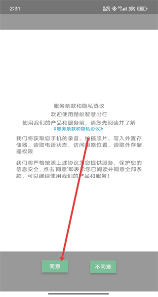 1、打開楚雄智慧出行APP,點擊同意按鈕,確認(rèn)服務(wù)條款和隱私協(xié)議,進入APP主界面。