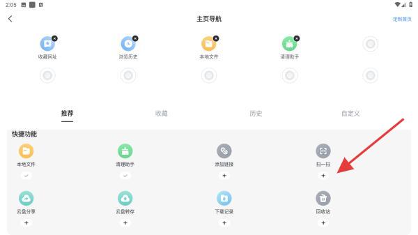 2、添加目標功能:點擊想要添加的功能,如掃一掃、云盤分享、云盤暫存等的+號圖標,該功能會自動加入。