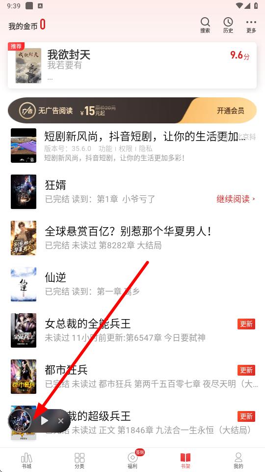 3、在書架頁面找到想聽讀的書籍,若出現(xiàn)聽書懸浮窗,點(diǎn)擊懸浮窗也能快速進(jìn)入聽書,并按步驟2開啟邊聽邊讀。