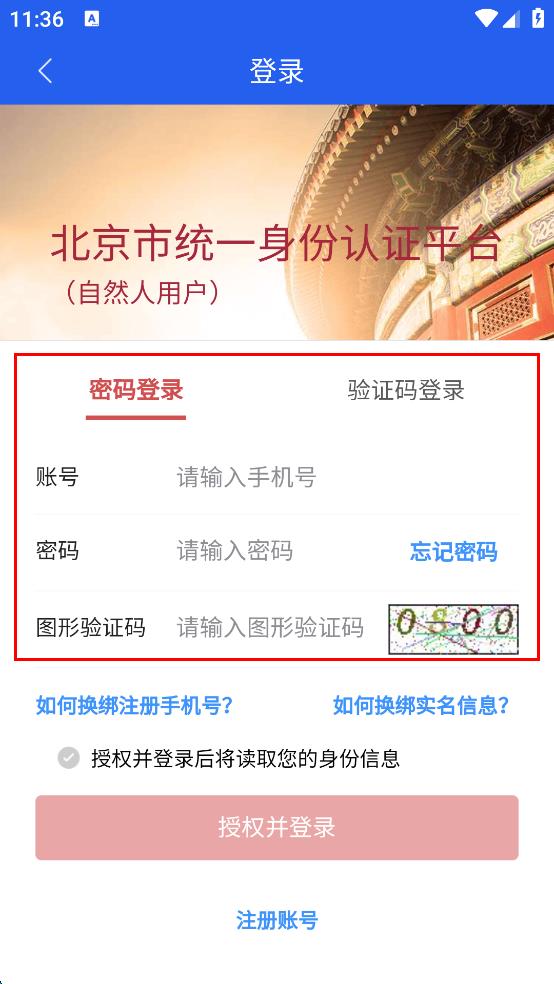 4、若選擇密碼登錄,在登錄界面輸入手機(jī)號(hào)、密碼以及圖形驗(yàn)證碼,確認(rèn)信息無誤后,點(diǎn)擊“授權(quán)并登錄”按鈕,完成登錄操作。
