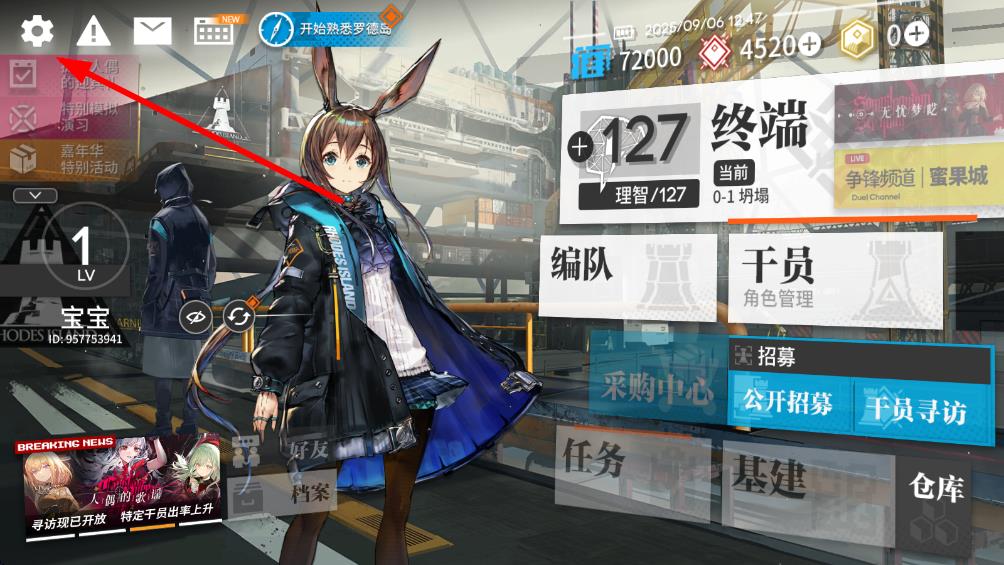 1、打開(kāi)明日方舟游戲,點(diǎn)擊主界面左上角的設(shè)置圖標(biāo)進(jìn)入設(shè)置界面。