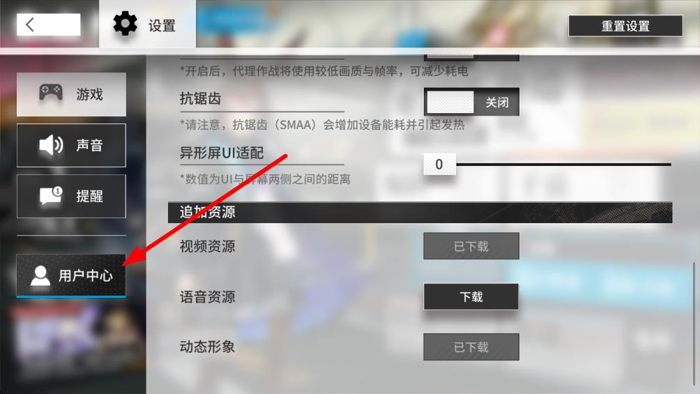2、在設(shè)置界面中點(diǎn)擊左側(cè)列表里的用戶中心選項(xiàng),彈出用戶中心操作窗口。