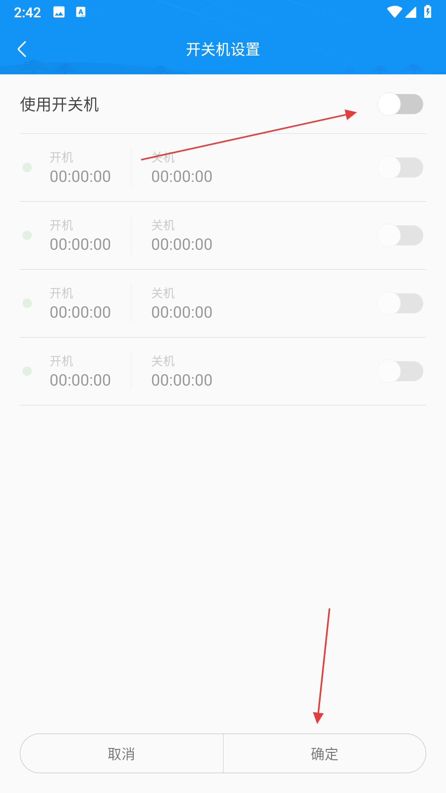3、點擊使用開關(guān)機右側(cè)的開關(guān)將其打開,隨后可設(shè)置多個時間段的開機和關(guān)機時間,設(shè)置完成后,點擊頁面底部的確定按鈕保存配置。