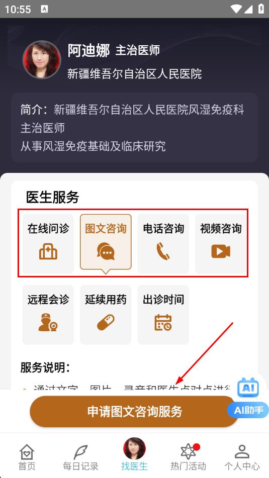 2、在醫(yī)生服務選項中,選擇一種咨詢方式,比如圖文咨詢,點擊申請圖文咨詢服務。
