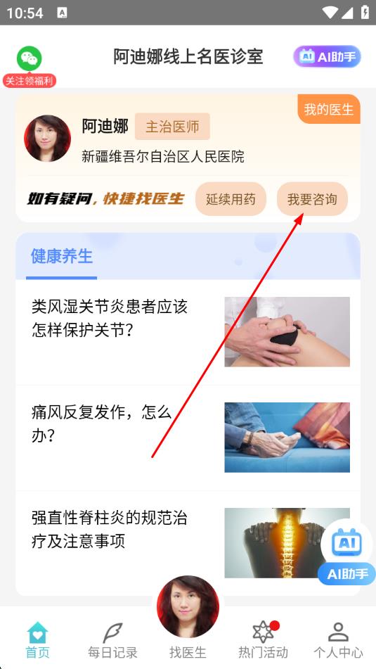1、打開風濕中心app,在首頁看到阿迪娜線上名醫(yī)診室,點擊我要咨詢按鈕。