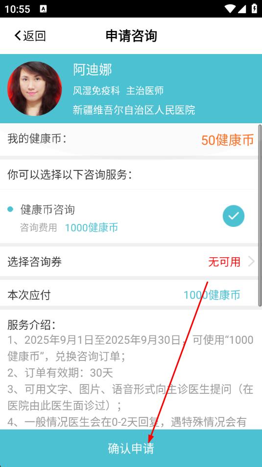 4、確認咨詢方式等信息無誤后,點擊確認申請按鈕,即可完成咨詢申請,等待醫(yī)生回復。