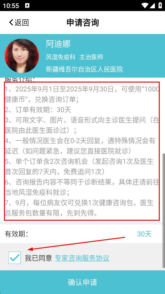 3、進入申請咨詢頁面,仔細閱讀服務介紹內容,勾選我已同意專家咨詢服務協(xié)議。