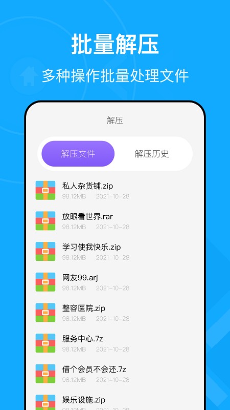 手機(jī)解壓縮王app是為用戶量身打造的解壓縮助手,能夠幫助您進(jìn)行多種圖片一鍵進(jìn)行批量處理,讓您能夠進(jìn)行壓縮,優(yōu)化手機(jī)內(nèi)存,還能為您進(jìn)行批量解壓縮處理,為您提供方便,操作十分簡(jiǎn)單。