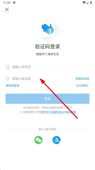 4、在驗(yàn)證碼登錄界面,輸入手機(jī)號(hào),獲取并填寫驗(yàn)證碼,勾選協(xié)議后點(diǎn)擊登錄完成操作。