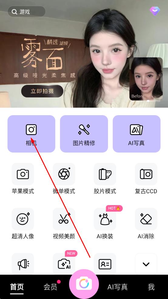 1、打開(kāi)美顏相機(jī)APP,在首頁(yè)點(diǎn)擊相機(jī)功能,進(jìn)入拍攝界面。