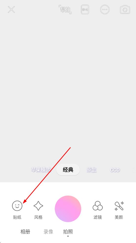 2、在拍攝界面底部,點(diǎn)擊貼紙選項(xiàng),展開(kāi)貼紙素材欄。