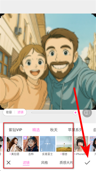 4、選擇好濾鏡后,點(diǎn)擊右下角的對(duì)勾按鈕確認(rèn),再點(diǎn)擊右上角的保存按鈕,即可完成圖片精修。