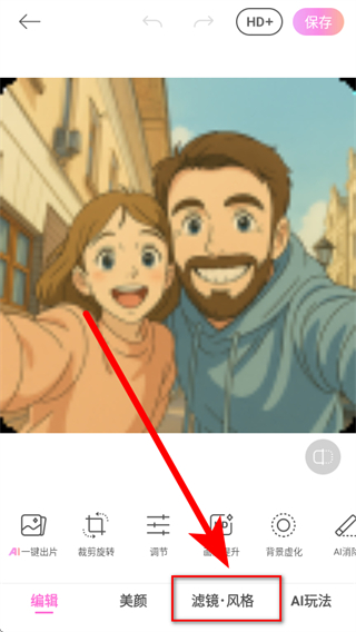 3、進(jìn)入精修頁(yè)面后,點(diǎn)擊濾鏡·風(fēng)格選項(xiàng),挑選喜歡的濾鏡樣式,如精選濾鏡中的美拉德、苦柿等。