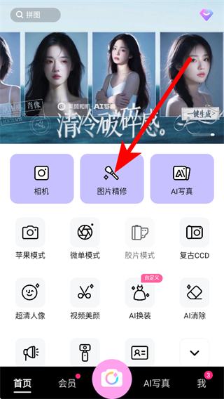 1、打開(kāi)美顏相機(jī)應(yīng)用,點(diǎn)擊圖片精修選項(xiàng)。