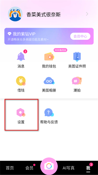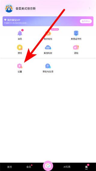 1、打開(kāi)美顏相機(jī)APP,進(jìn)入個(gè)人頁(yè)面后點(diǎn)擊設(shè)置,進(jìn)入設(shè)置頁(yè)面。