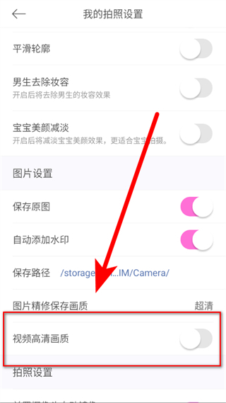 4、在我的拍照設(shè)置頁(yè)面,找到視頻高清畫(huà)質(zhì)選項(xiàng),將其開(kāi)關(guān)打開(kāi),即可開(kāi)啟美顏相機(jī)的視頻高清畫(huà)質(zhì)模式。