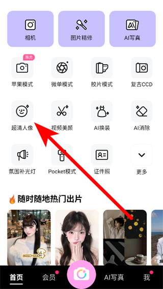 1、打開(kāi)美顏相機(jī)APP,在首頁(yè)找到超清人像選項(xiàng)并點(diǎn)擊,進(jìn)入超清拍照設(shè)置頁(yè)面。
