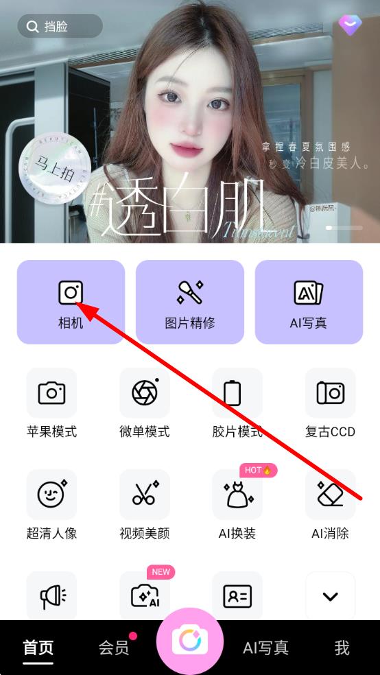 1、打開美顏相機(jī)APP,點(diǎn)擊首頁相機(jī)進(jìn)入拍攝界面,開啟拍攝流程。