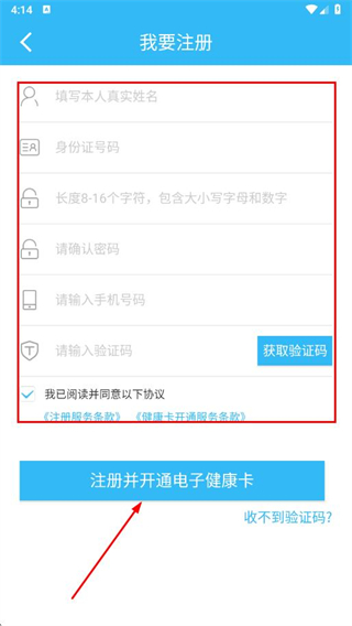 4、填寫個(gè)人信息等,勾選協(xié)議,點(diǎn)擊注冊(cè)并開通電子健康卡完成注冊(cè)。
