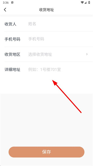 4、在收貨地址頁(yè)面,可輸入地址信息,點(diǎn)擊保存按鈕,完成收貨信息管理操作。