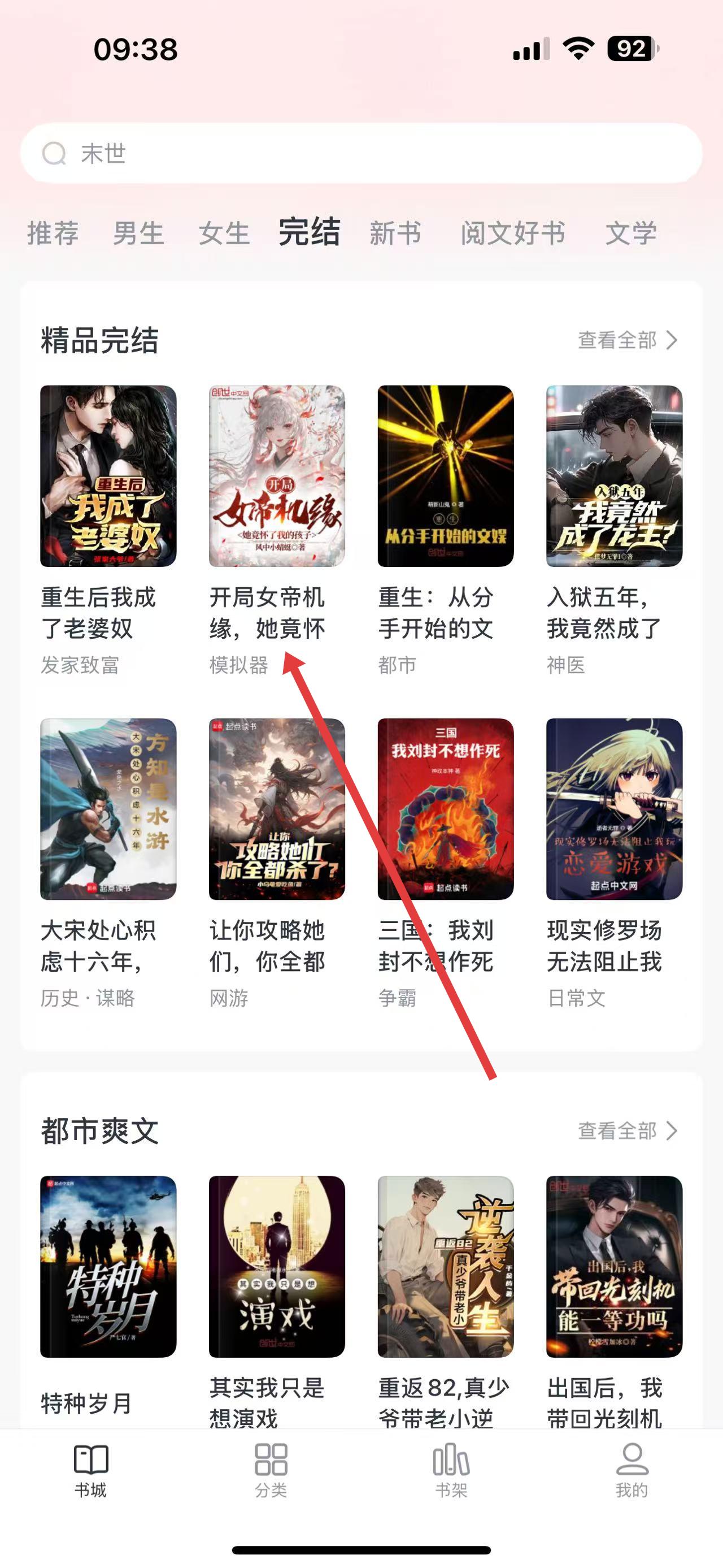 1、打開全本免費閱讀器應(yīng)用,在書城頁面,選擇一本想聽的小說,比如點擊開局女帝機緣。