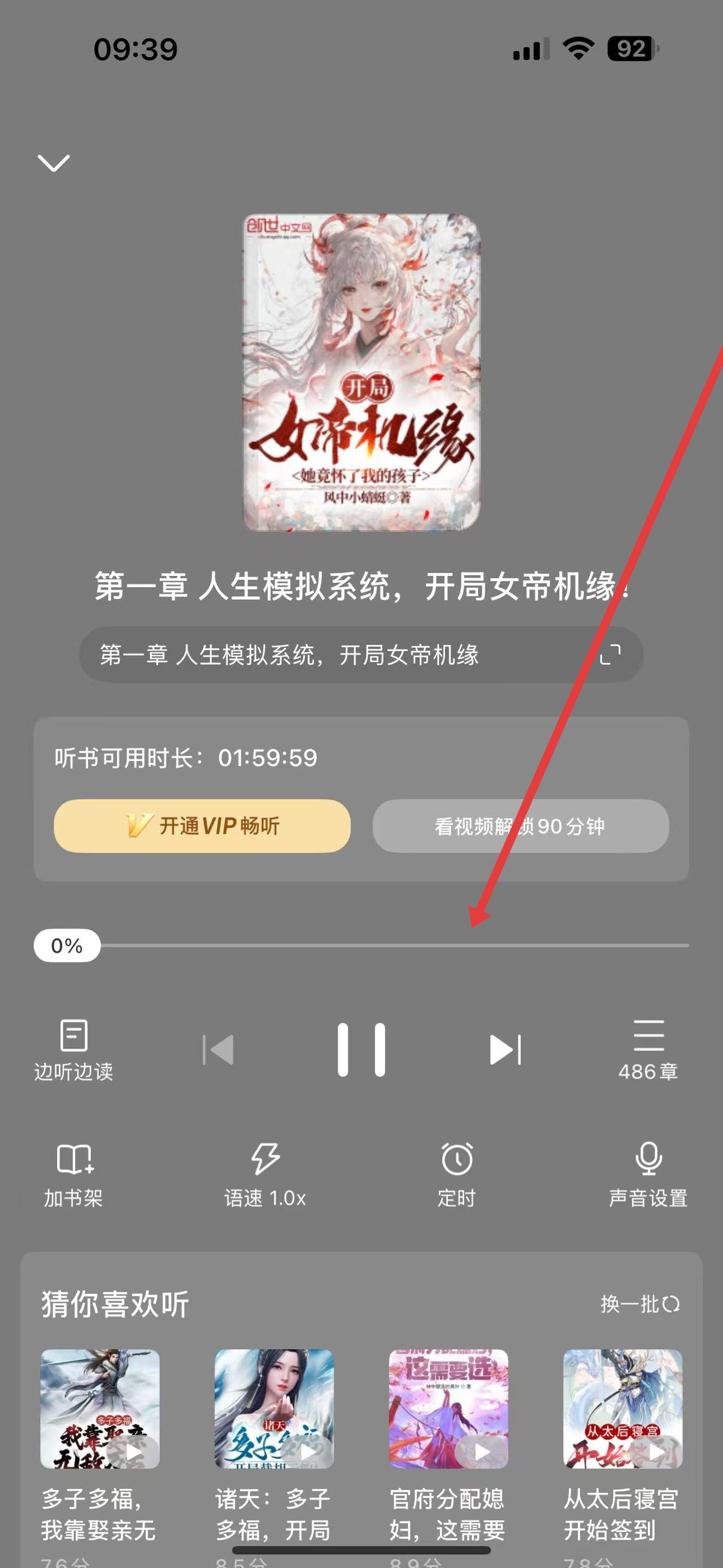3、進入聽書界面后,可以進行設(shè)置聽書可用時長、調(diào)節(jié)語速、定時、聲音設(shè)置等操作,還能查看猜你喜歡聽的其他書籍。