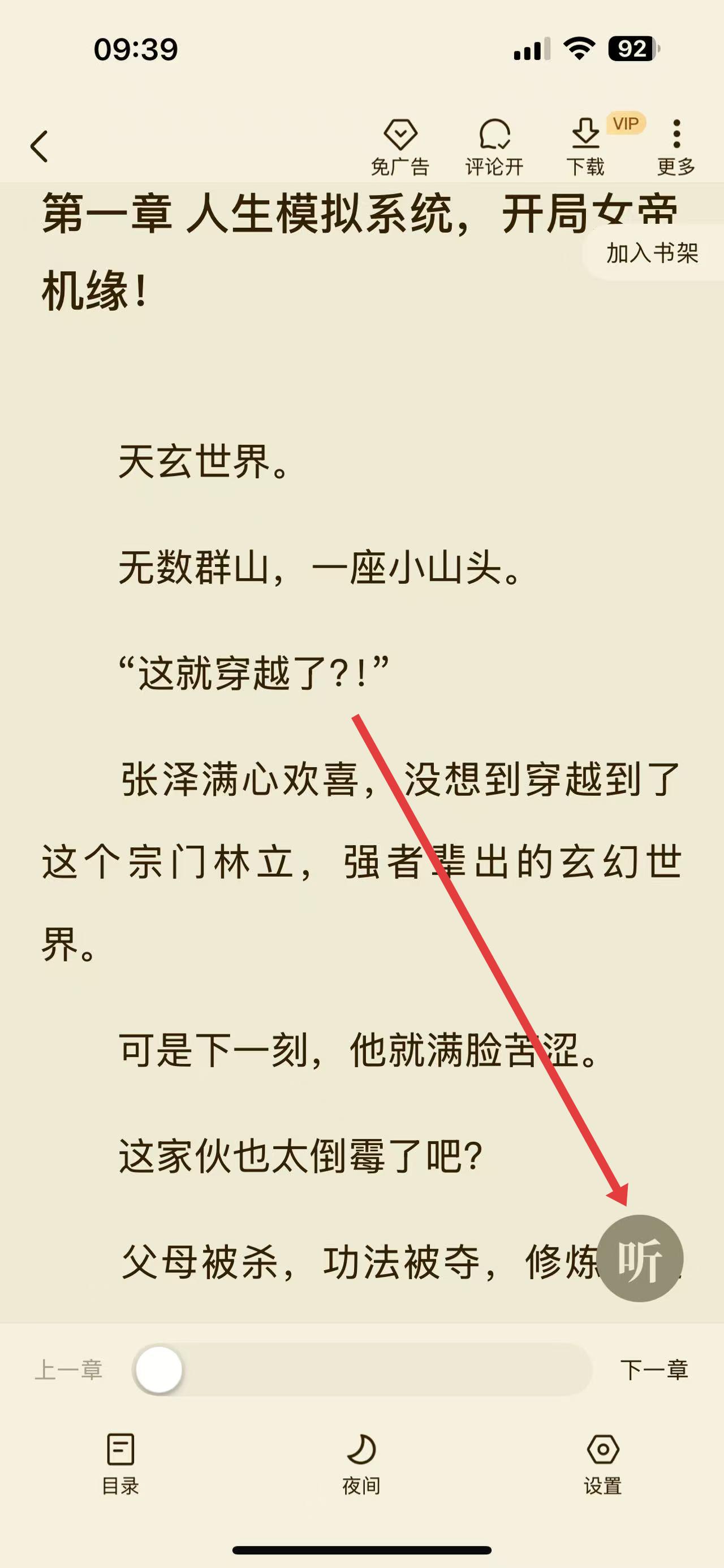 2、進入小說閱讀界面后,點擊屏幕,找到并點擊閱讀界面中出現(xiàn)的聽按鈕。