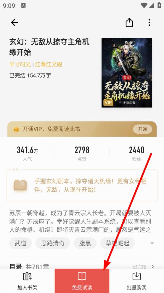 2、進入小說詳情頁,點擊免費試讀按鈕進入閱讀界面。