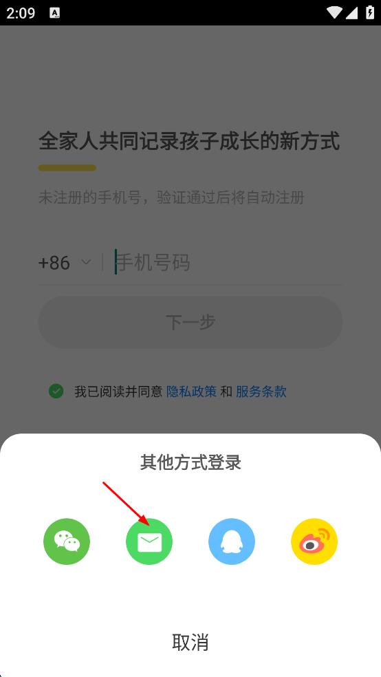 1、打開成長記錄軟件,在登錄界面點擊左下角“其他方式登錄”,彈出其他登錄方式選擇框。