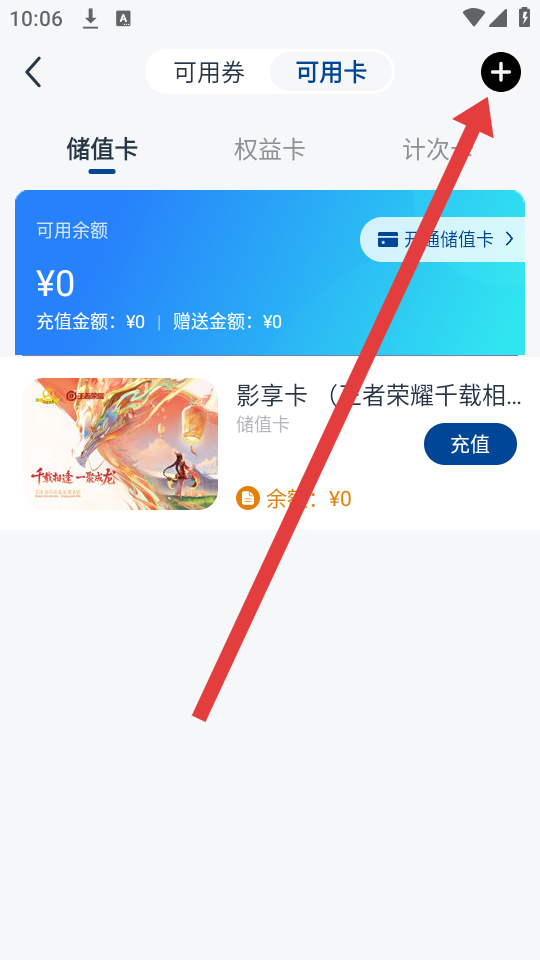 2、在可用卡的頁面右上角,我們需要點擊黑色圓形的+按鈕,進入后續(xù)綁卡的操作流程。