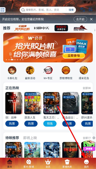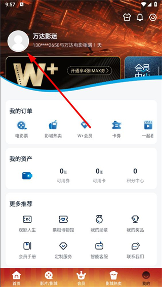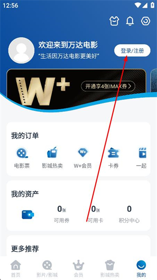 1、打開萬達電影app,在首頁點擊右下角我的選項,進入個人頁面。