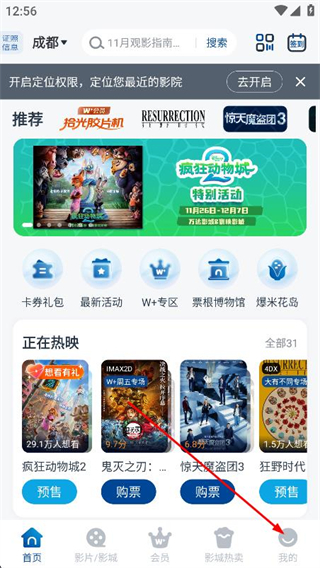 1、打開萬達電影APP,點擊底部導(dǎo)航欄我的選項。