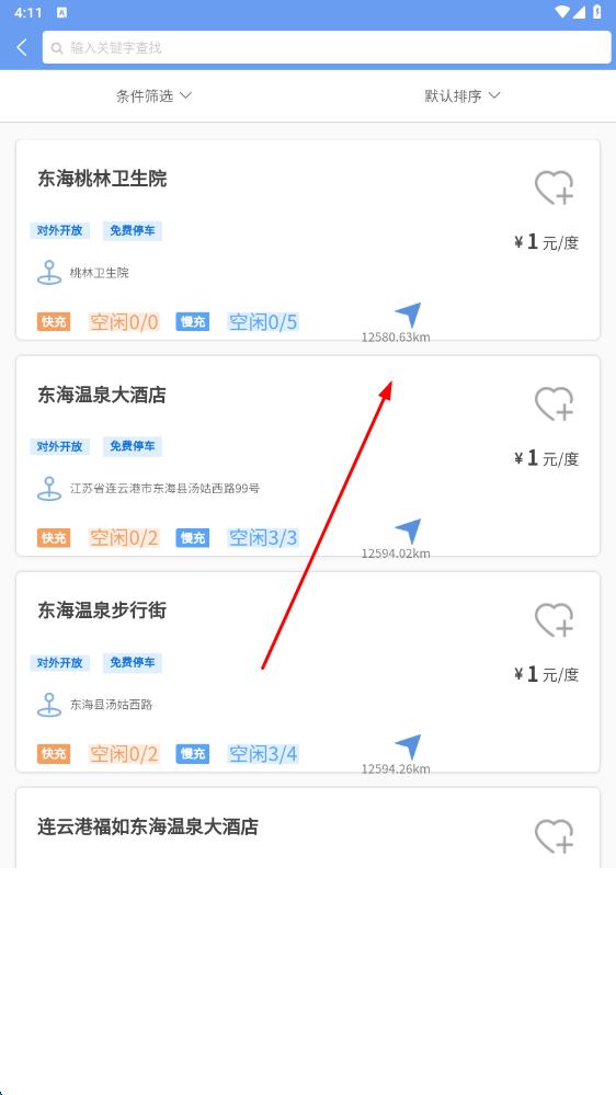 2、進(jìn)入篩選界面,瀏覽列表里的電站信息,根據(jù)需求,如電價、距離等,選定要查看的電站,點(diǎn)擊進(jìn)入詳情 。