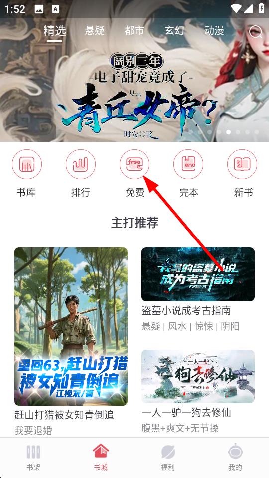 1、打開火星小說app,進(jìn)入書城界面,點(diǎn)擊下方導(dǎo)航欄中的免費(fèi)選項(xiàng)。
