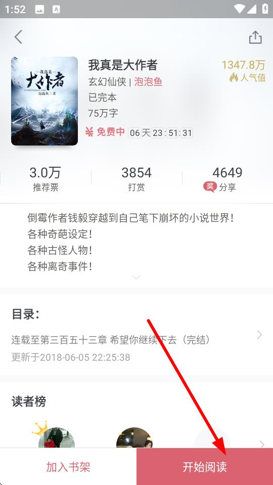 3、進(jìn)入小說詳情頁面后,查看小說的基本信息,確認(rèn)后點(diǎn)擊開始閱讀按鈕。