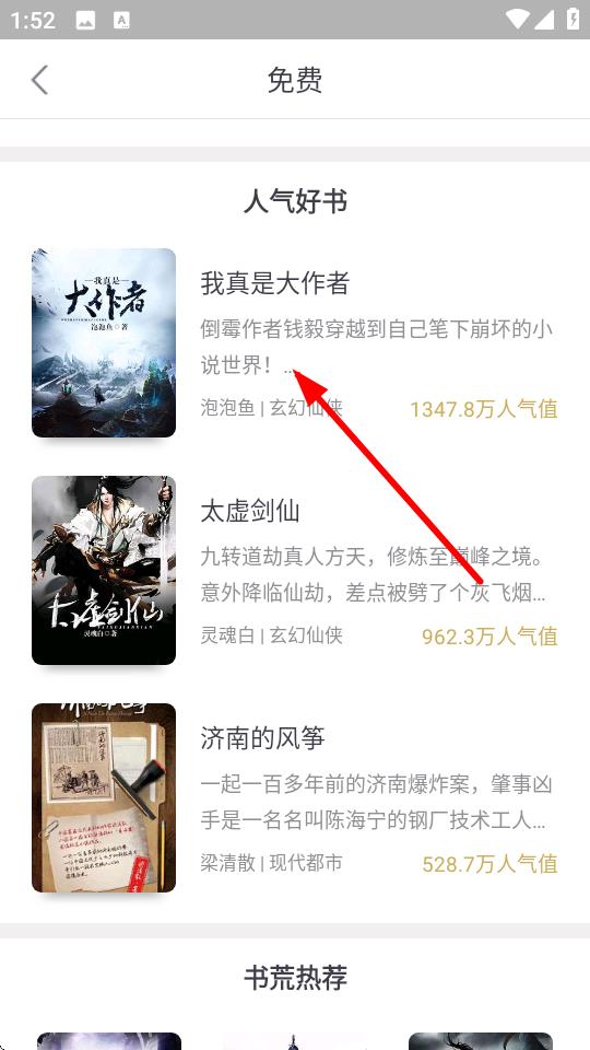 2、在免費(fèi)頁面的人氣好書或其他分類中,選擇你想閱讀的小說,例如點(diǎn)擊我真是大作者。