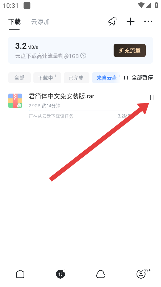 2、在下載任務(wù)的列表中,我們需要找到正在進(jìn)行的下載任務(wù),然后點(diǎn)擊任務(wù)右側(cè)的暫停按鈕。