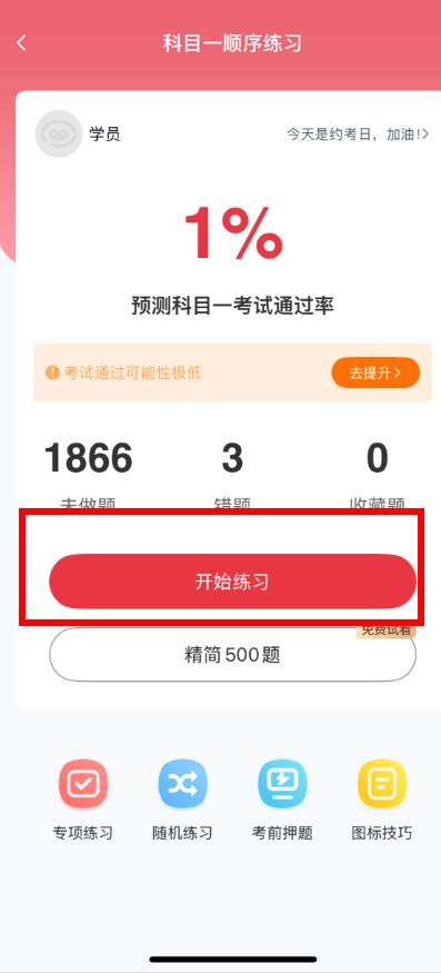 2、在科目一頁(yè)面,點(diǎn)擊順序練習(xí)板塊,進(jìn)入科目一順序練習(xí)界面,點(diǎn)擊開(kāi)始練習(xí)按鈕。